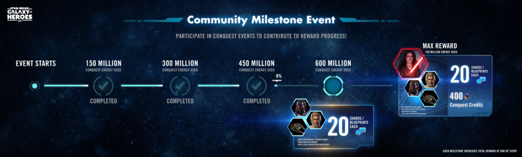 世界中のプレイヤーが使用する征服エネルギーが対象となっており、アナタの一票(征服での戦闘)が世界のSWGoHプレイヤーの幸せを運びます。