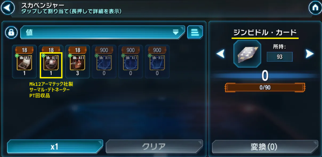 まず、ダークサイドバトルのハードノードで入手できる「Mk12アーマテック社製サーマル・デトネーターPT回収品」は、レリック資材のジンビドル・カードを作成するために使用できます。