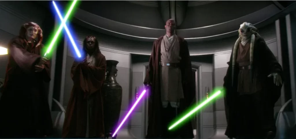 映画『スター・ウォーズ エピソードIII/シスの復讐』本編で、パルパティーン最高議長こそがシスの暗黒卿だったことを知ったメイス・ウィンドゥは、3名のジェダイ・マスターを率いてパルパティーンの逮捕に向かいます。