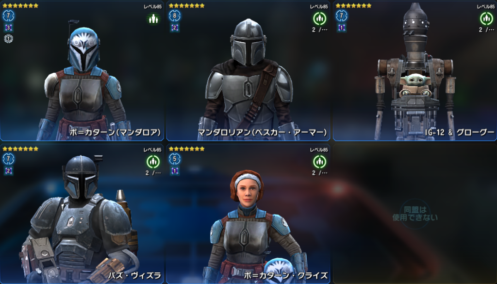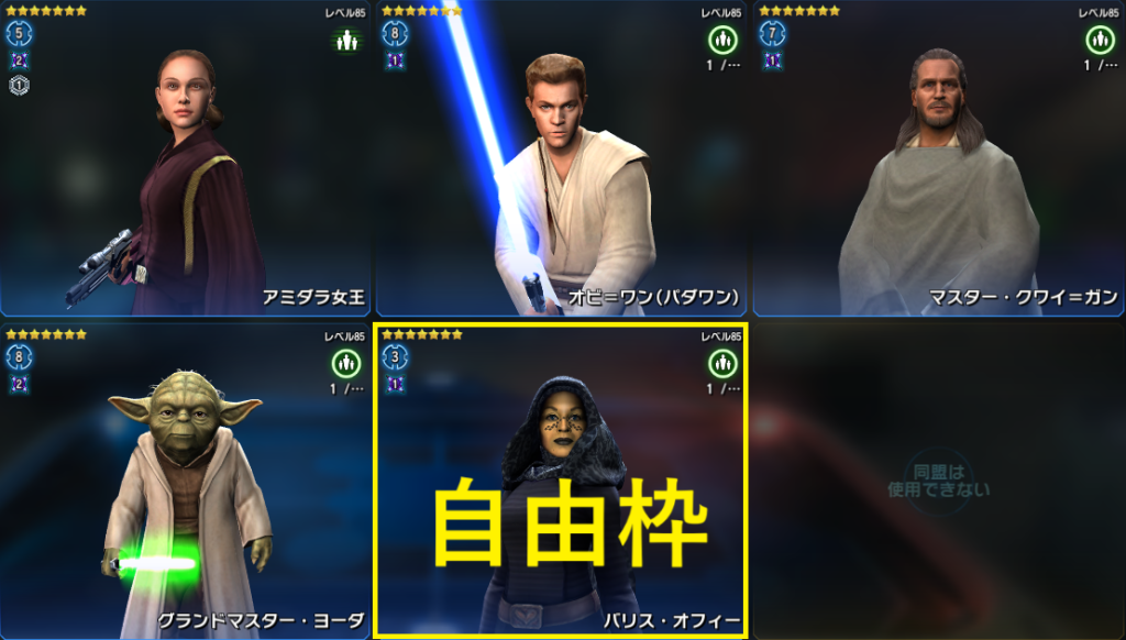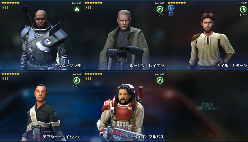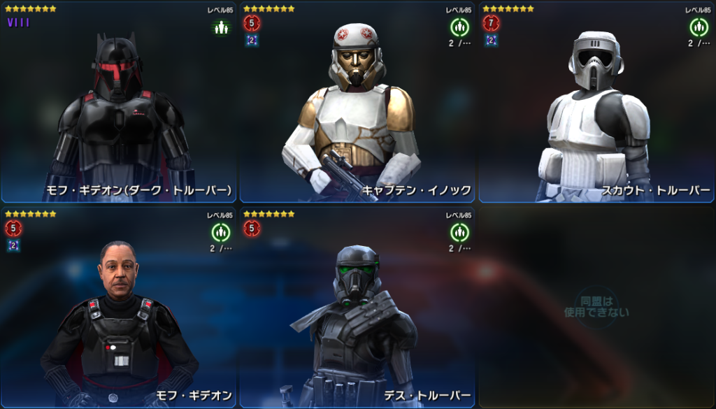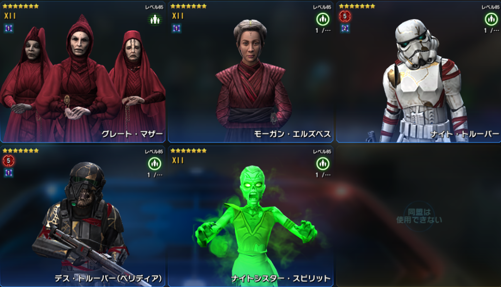 ※ ダース・ベインの編成は2人で、レリックレベルが高いシスであれば誰でも良いため推奨チーム画像は省略します。