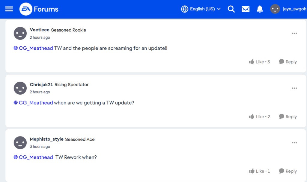 このアップデート投稿に対し、プレイヤーからの返信には「TWのアップデート」を望む声が続出しています。