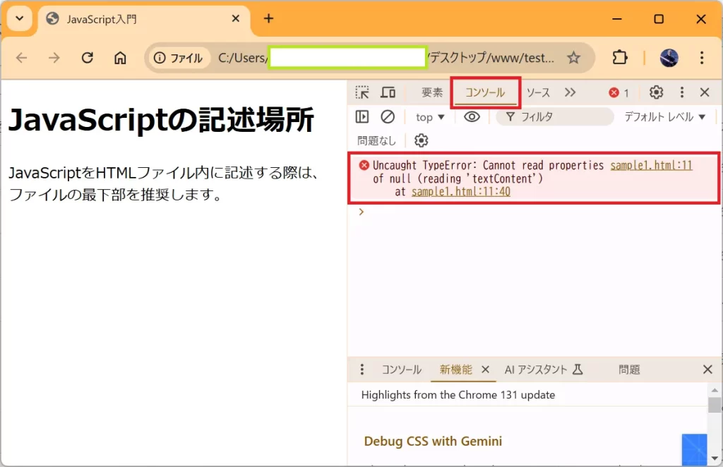 今回のサンプルプログラムをHTML上部に記述して実行すると、👆のとおりエラーが発生しました。
