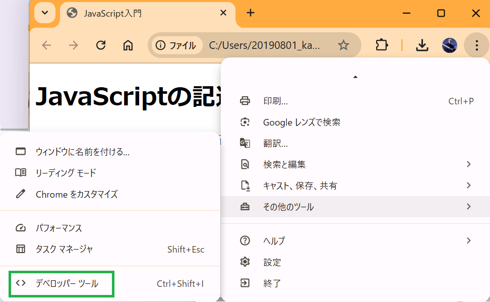 3. 「デベロッパー ツール」を選択します。(Microsoft Edgeの場合は「開発者ツール」)