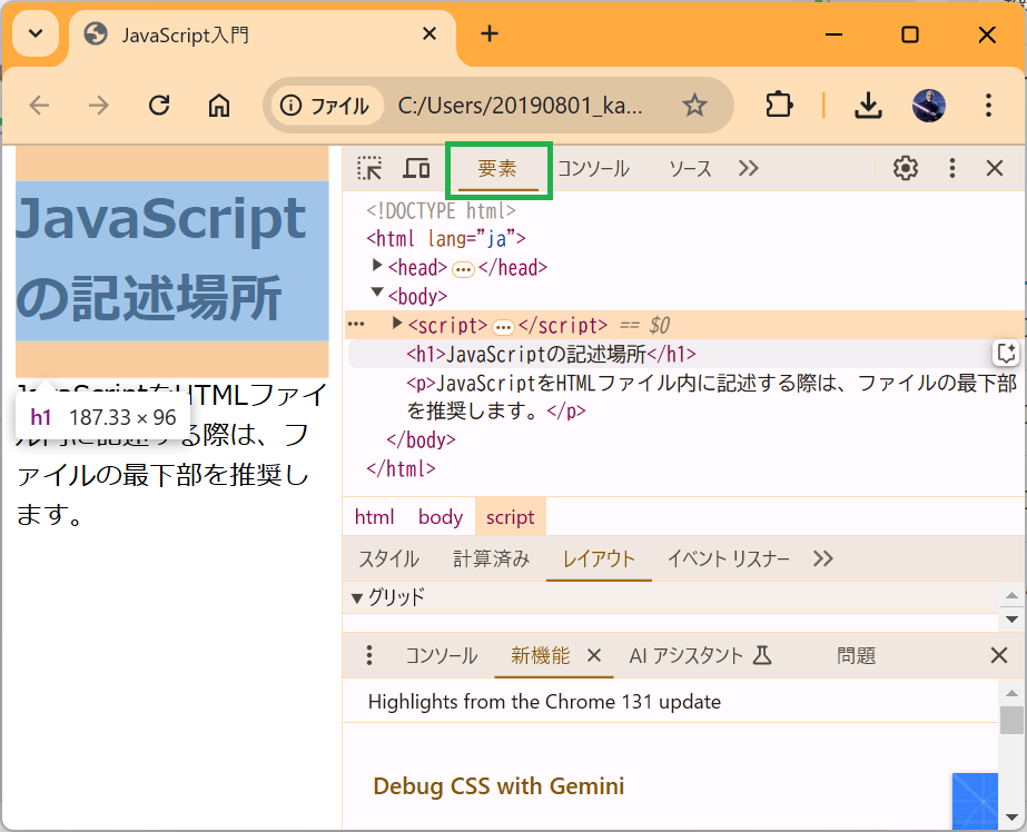 「要素」タブは、HTMLの要素を、CSSのスタイルと併せて詳細に確認することができます。
