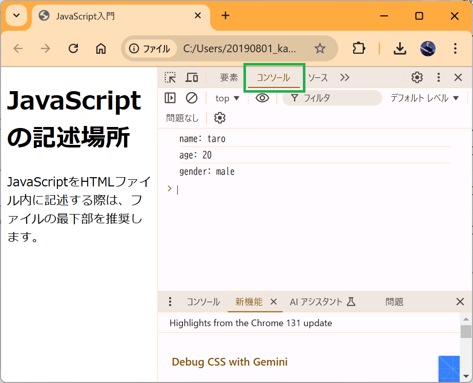 「コンソール」タブには、プログラムでのエラー原因がメッセージとして表示されます。