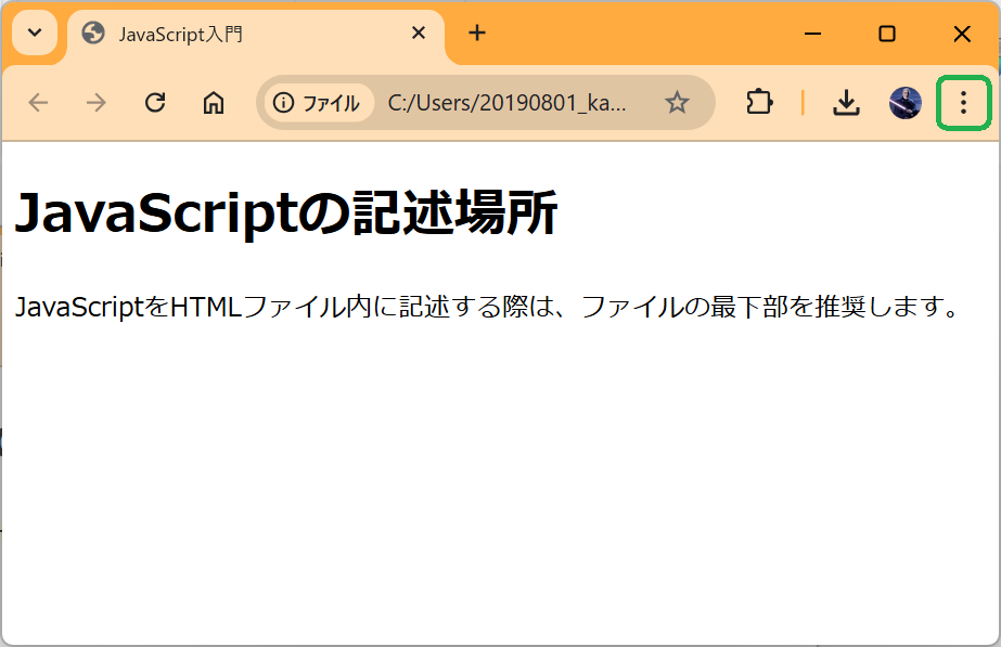 1. ブラウザの右上にある三点メニュー(緑枠で囲まれている箇所)をクリックします。