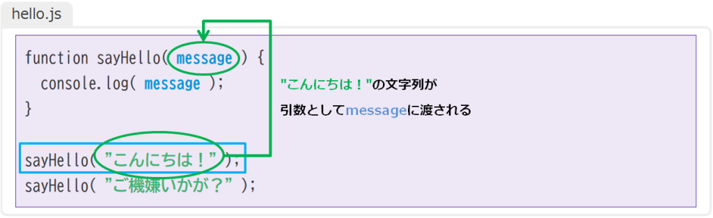 2つ目の sayHello 関数の呼び出しも同様の考え方で、下図のようにデータが受け渡され、コンソールに「ご機嫌いかが?」が表示されます。
