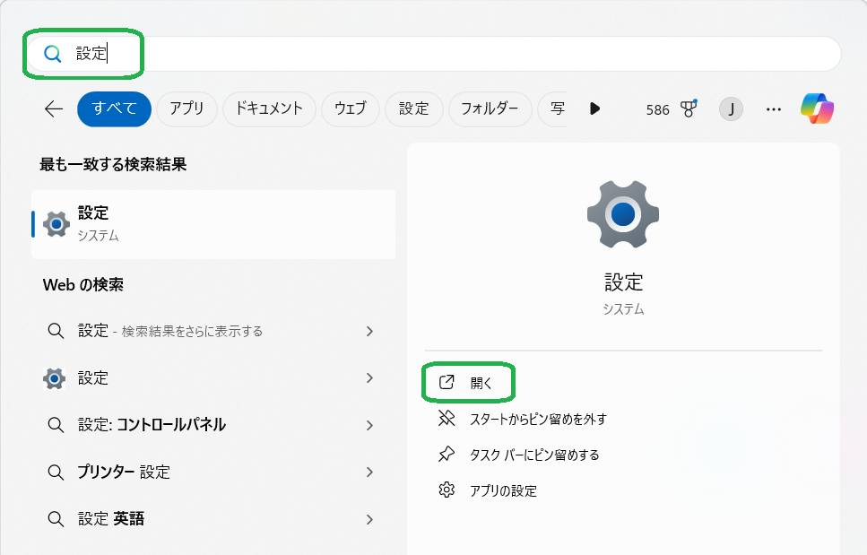検索用の入力ボックスに「設定」と入力します。