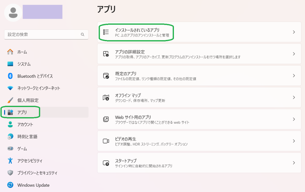 「アプリ」を選択後、「インストールされているアプリ」をクリックして開きます。