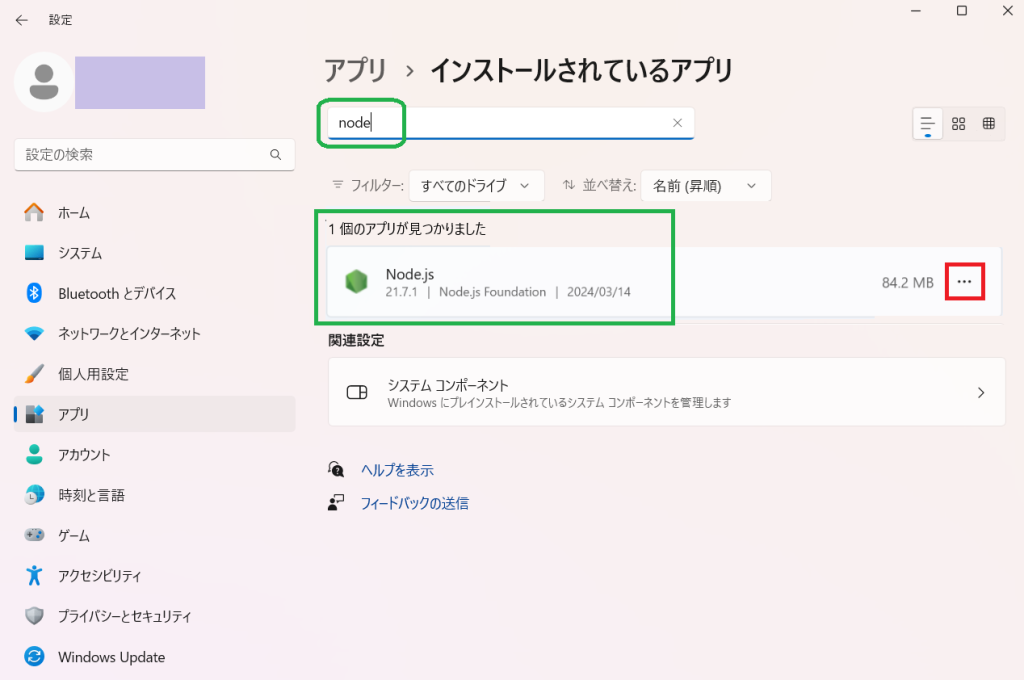 「node」を検索した結果、画像のようにヒットした場合は、三点メニュー(赤枠)をクリックしてアンインストールしてください。