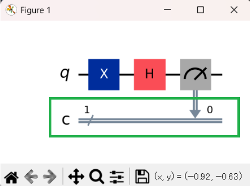 前回記事のプログラムで作成した量子回路図で、測定ゲート(メーターのアイコン)の下に描かれている二重線を古典ビット(C)と呼びました。