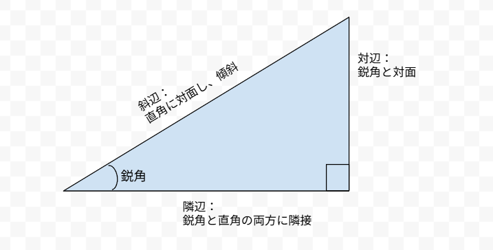 これらの定義を覚えるコツは、各辺が「鋭角と面している(=対辺)鋭角と直角の両方に接している(=隣辺)直角と対面し傾している(=斜辺)」をしっかり区別することです。