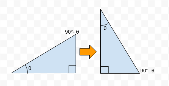 直角三角形において、直角(\(90^\circ\))を除いた残りの2つの鋭角を \(\theta\) と \(\mathbf{90^\circ – \theta}\) とします。