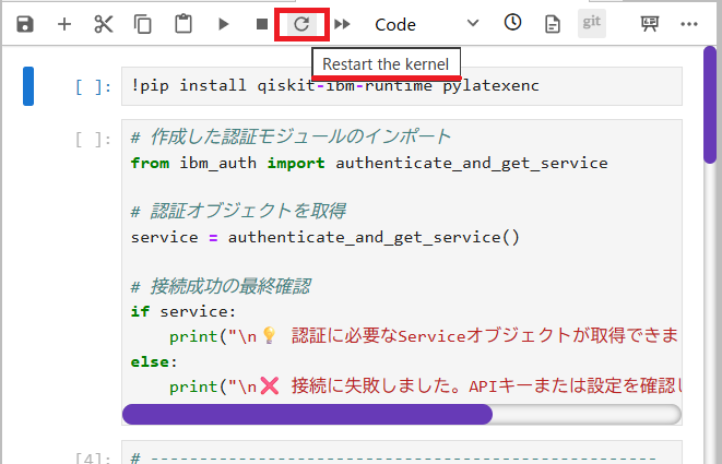 ibm_auth.py ファイルを保存したら、作成済ノートブック「bell_state_experiment.ipynb」の二番目のセル(セル2)でモジュールをインポートして関数を実行し、認証が成功するかどうかを確認します。