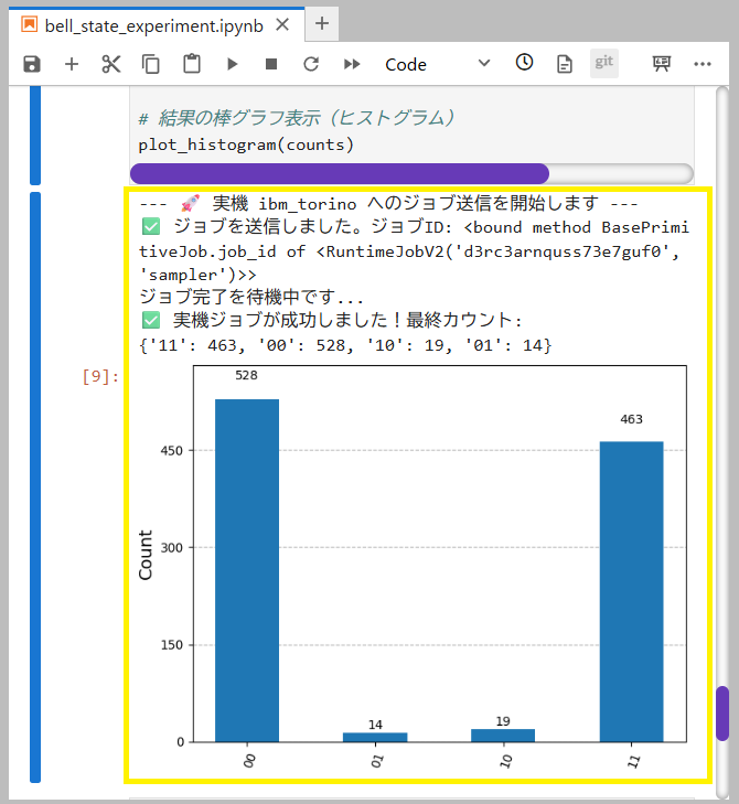 ノートブック「bell_state_experiment.ipynb」のセル8に次のプログラムを入力してください。