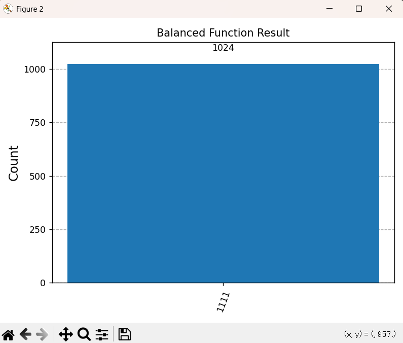 本記事のプログラムではオラクルにXOR演算を使用しており、実装する \(f(x) = x_1 \oplus x_2 \oplus x_3 \oplus x_4\) の場合、測定結果は15通りのいずれかではなく、必ず \(\boldsymbol{1111}\) になることが確定しています。