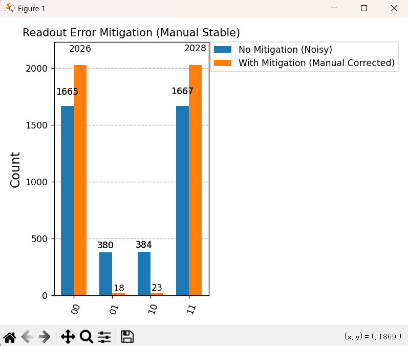 Qiskit機能であれ、手動での補正であれ、この「補正行列 (\mathbf{M}^{-1}) を適用する」という数学的な操作を行っている点では全く同じであり、これがリードアウトエラー緩和の核心的な原理なのですから。