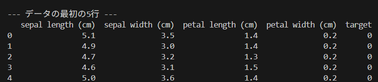 AIが4つの数値(特徴量)を見て、品種(ターゲット)を予測する学習タスクに取り組むための準備が完了です。
