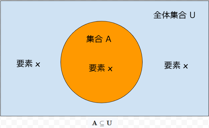 任意の集合 \(A\) は、必ず全体集合 \(U\) の部分集合となります。